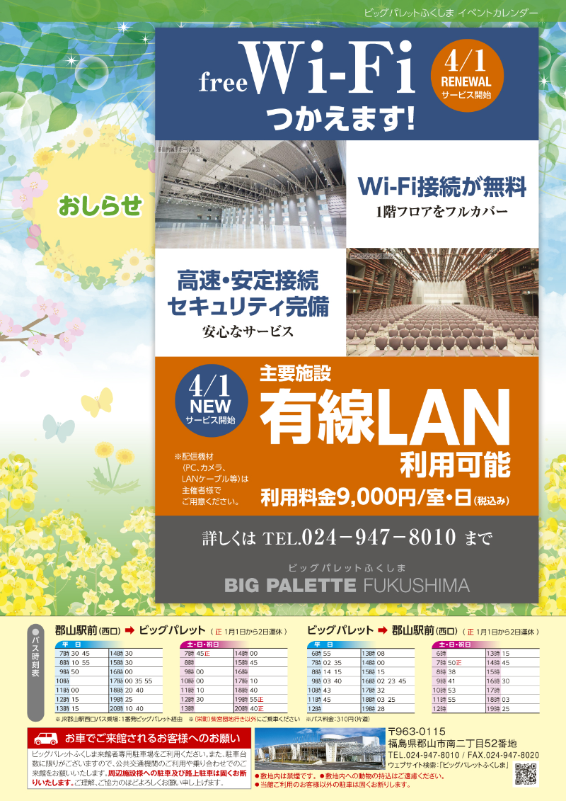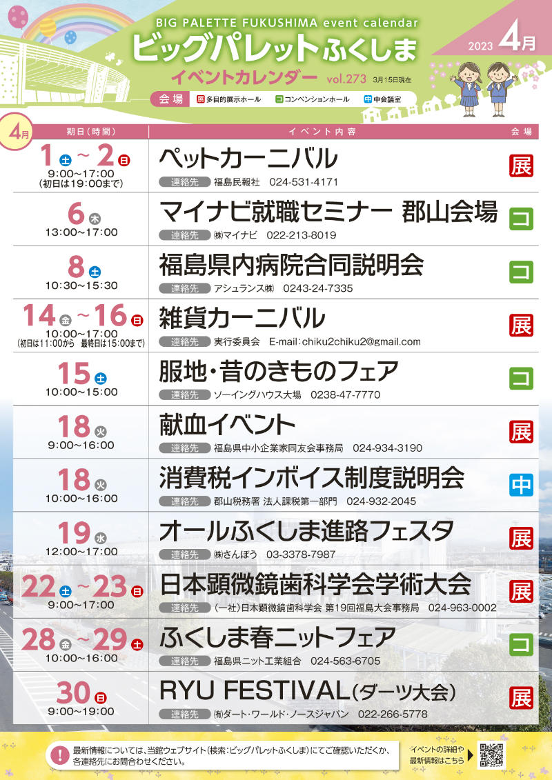 2023年3月27日(月) 令和5年4月号イベントカレンダー発行のお知らせ 4月号イベントカレンダーチラシとポスターを発行しました。ホームページのイベントカレンダーは随時更新しています。 添付データ イベントカレンダー4月号(3052.7KB) ビッグパレットからのお知らせ 2026年3月3日(火) 施設空き状況のお知らせ 2026年2月25日(水) 令和8年3月号イベントカレンダー発行のお知らせ 2026年1月25日(日) 令和8年2月号イベントカレンダー発行のお知らせ View AllTOP