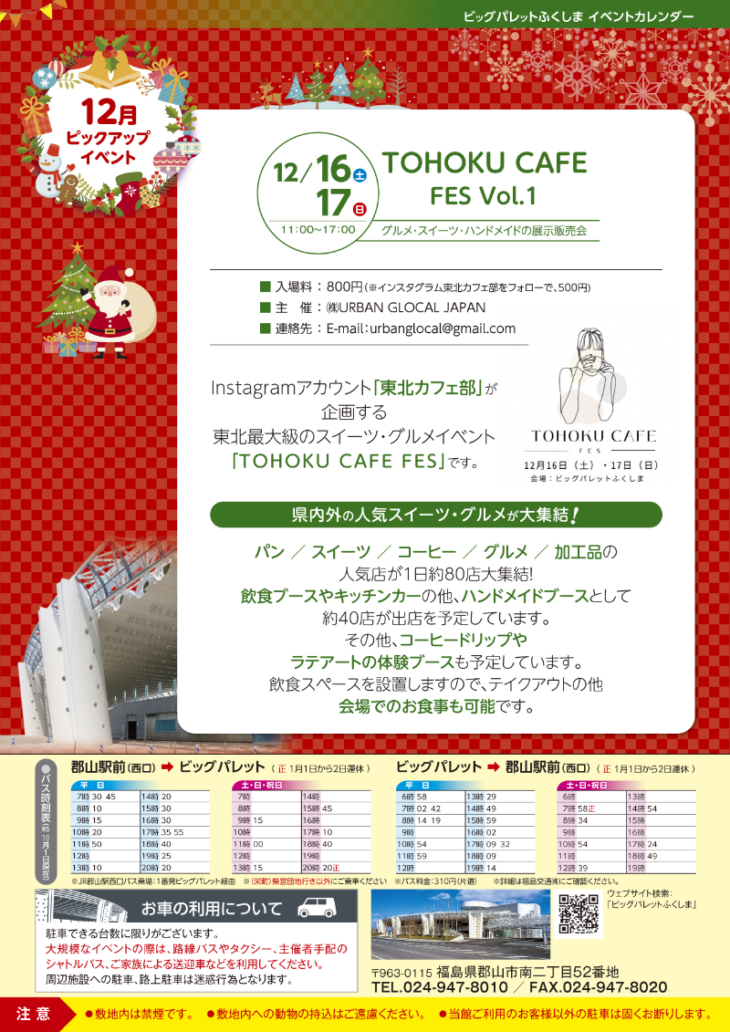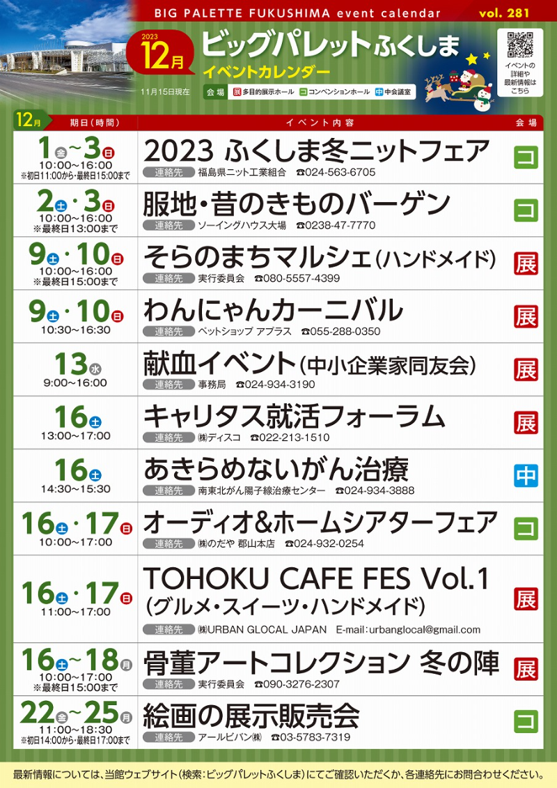 2023年11月24日(金) 令和5年12月号イベントカレンダー発行のお知らせ 12月号イベントカレンダーチラシとポスターを発行しました。ホームページのイベントカレンダーは随時更新しています。 添付データ イベントカレンダー12月号.pdf(1612KB) ビッグパレットからのお知らせ 2026年1月20日(火) 1月25日(日)の催事に伴う臨時バスダイヤについて 2026年1月15日(木) 施設空き状況のお知らせ 2025年12月23日(火) 令和8年1月号イベントカレンダー発行のお知らせ View AllTOP