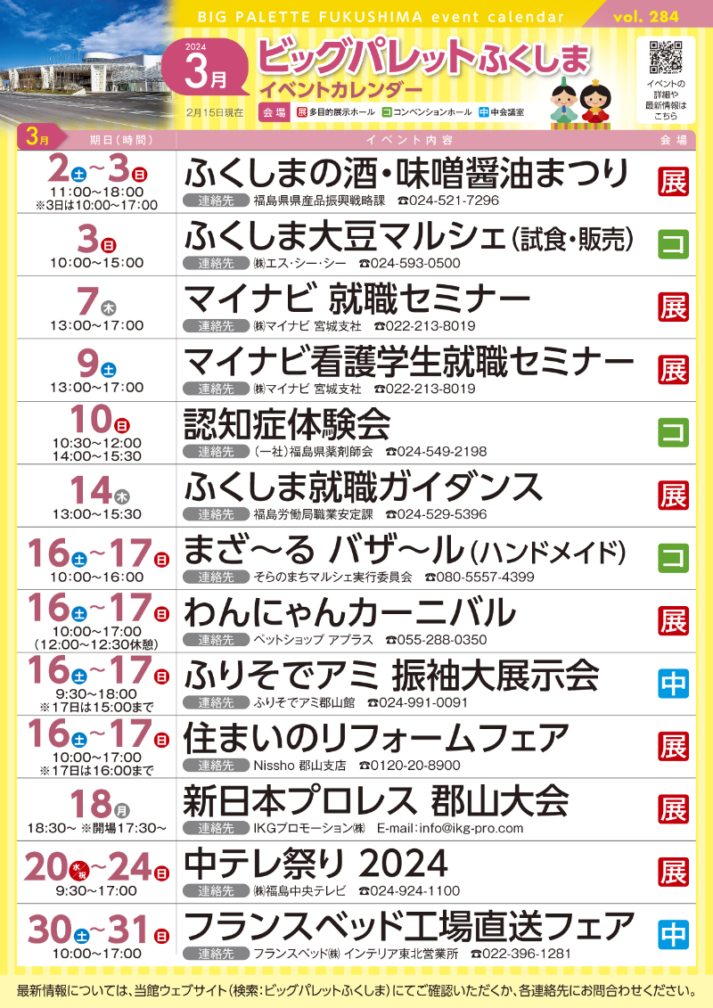 2024年2月25日(日) 令和6年3月号イベントカレンダー発行のお知らせ 3月号イベントカレンダーチラシとポスターを発行しました。ホームページのイベントカレンダーは随時更新しています。 添付データ 令和6年3月号イベントカレンダー.pdf(3422.1KB) ビッグパレットからのお知らせ 2026年3月26日(木) 令和8年4月号イベントカレンダー発行のお知らせ 2026年3月16日(月) 施設空き状況のお知らせ 2026年2月25日(水) 令和8年3月号イベントカレンダー発行のお知らせ View AllTOP