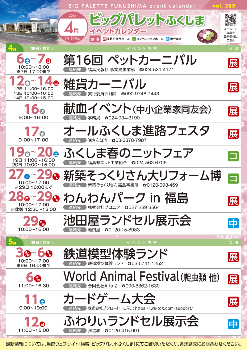 2024年3月25日(月) 令和6年4月号イベントカレンダー発行のお知らせ 4月号イベントカレンダーチラシとポスターを発行しました。ホームページのイベントカレンダーは随時更新しています。 添付データ 令和6年4月号イベントカレンダー.pdf(3721.1KB) ビッグパレットからのお知らせ 2026年4月17日(金) 施設空き状況のお知らせ 2026年3月26日(木) 令和8年4月号イベントカレンダー発行のお知らせ 2026年2月25日(水) 令和8年3月号イベントカレンダー発行のお知らせ View AllTOP