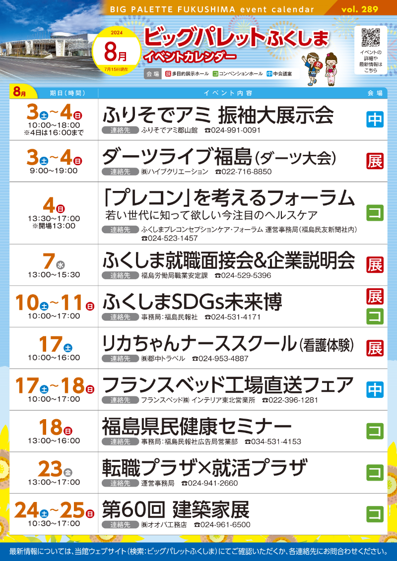 2024年7月25日(木) 令和6年8月号イベントカレンダー発行のお知らせ 8月号イベントカレンダーチラシとポスターを発行しました。ホームページのイベントカレンダーは随時更新しています。 添付データ 令和6年8月号イベントカレンダー.pdf(2716.7KB) ビッグパレットからのお知らせ 2026年3月3日(火) 施設空き状況のお知らせ 2026年2月25日(水) 令和8年3月号イベントカレンダー発行のお知らせ 2026年1月25日(日) 令和8年2月号イベントカレンダー発行のお知らせ View AllTOP