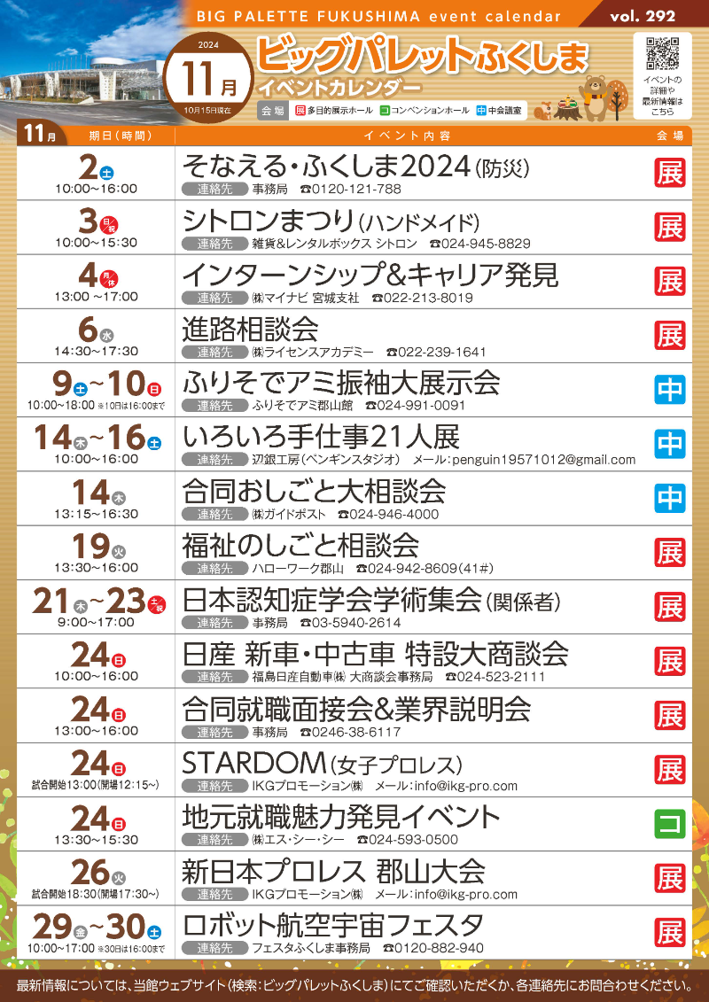 2024年10月25日(金) 令和6年11月号イベントカレンダー発行のお知らせ 11月号イベントカレンダーチラシとポスターを発行しました。ホームページのイベントカレンダーは随時更新しています。 添付データ 令和6年11月号イベントカレンダー.pdf(3027.4KB) ビッグパレットからのお知らせ 2026年2月25日(水) 令和8年3月号イベントカレンダー発行のお知らせ 2026年2月18日(水) 施設空き状況のお知らせ 2026年1月25日(日) 令和8年2月号イベントカレンダー発行のお知らせ View AllTOP