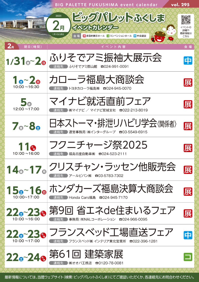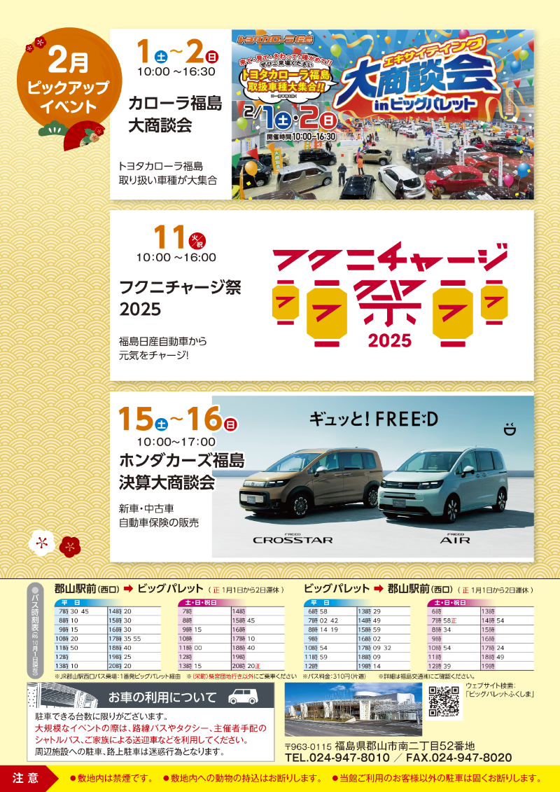 2025年1月24日(金) 令和7年2月号イベントカレンダー発行のお知らせ 2月号イベントカレンダーチラシとポスターを発行しました。ホームページのイベントカレンダーは随時更新しています。 添付データ PDFデータ(1293.5KB) ビッグパレットからのお知らせ 2026年1月20日(火) 1月25日(日)の催事に伴う臨時バスダイヤについて 2026年1月15日(木) 施設空き状況のお知らせ 2025年12月23日(火) 令和8年1月号イベントカレンダー発行のお知らせ View AllTOP