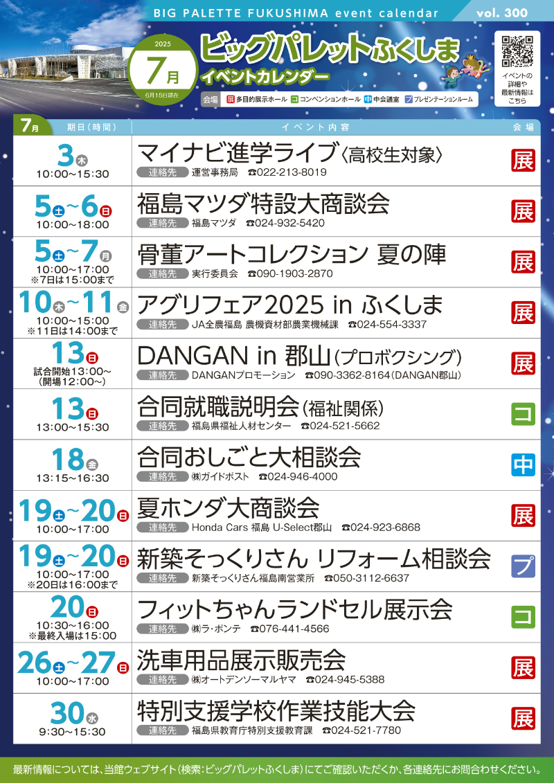 2025年6月25日(水) 令和7年7月号イベントカレンダー発行のお知らせ 7月号イベントカレンダーチラシとポスターを発行しました。ホームページのイベントカレンダーは随時更新しています。 添付データ イベントカレンダー7月号PDF(2771.5KB) ビッグパレットからのお知らせ 2026年3月26日(木) 令和8年4月号イベントカレンダー発行のお知らせ 2026年3月16日(月) 施設空き状況のお知らせ 2026年2月25日(水) 令和8年3月号イベントカレンダー発行のお知らせ View AllTOP