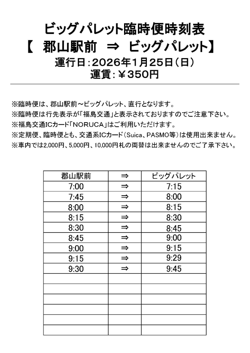 2026年1月20日(火) NEW 1月25日(日)の催事に伴う臨時バスダイヤのご案内 1月25日(日)の催事に伴う臨時バスダイヤのご案内をいたします。 ビッグパレットからのお知らせ 2026年1月20日(火) 1月25日(日)の催事に伴う臨時バスダイヤのご案内 2026年1月15日(木) 施設空き状況のお知らせ 2025年12月23日(火) 令和8年1月号イベントカレンダー発行のお知らせ View AllTOP