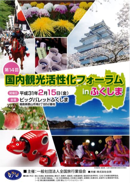 国内観光活性化を図るため全国から観光関係者が参加する大会ではふくしまの良さを紹介する。(アトラクション、基調講演、記念講演等)出展ブースは観光PR、特産品の販売を行う。