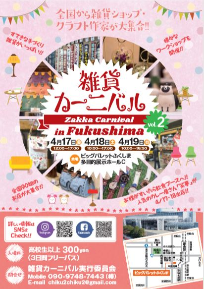 4月17日~19日開催予定の雑貨カーニバル in Fukushima Vol.2は、7月31日~8月2日に開催が延期されました。詳細に関しては、主催者へご確認をお願いいたします。