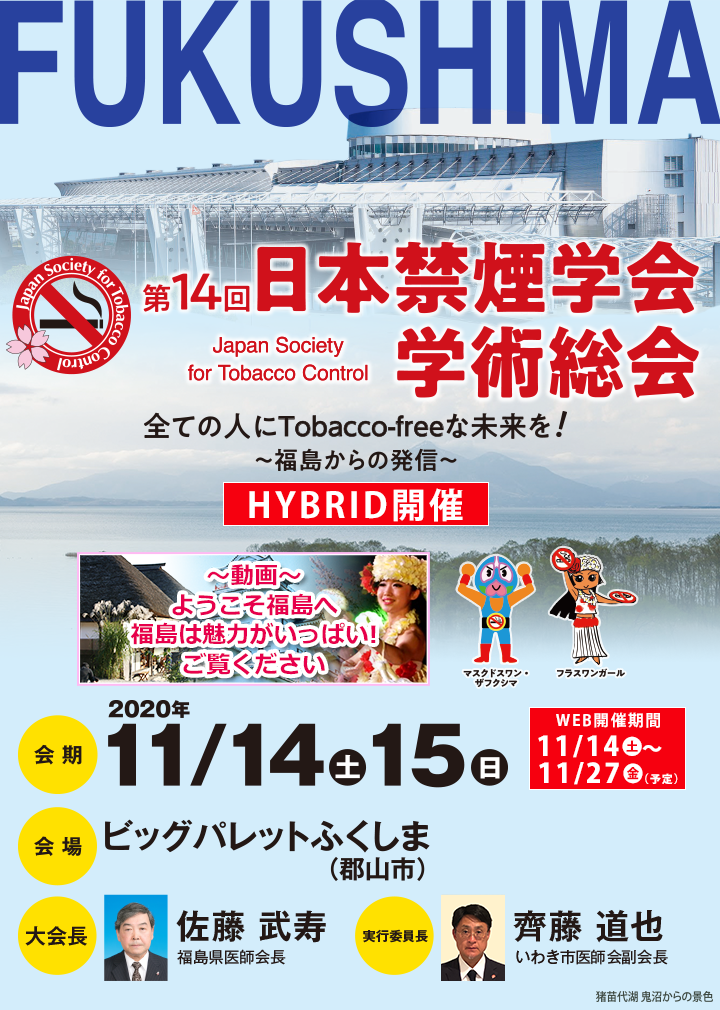 テーマ「全ての人にTobacco-freeな未来を!~福島から発信~」 会場開催は11月14日(土)のみ、15日(日)は認定試験及び市民公開講座の開催となります。詳細はホームページにてご確認ください。