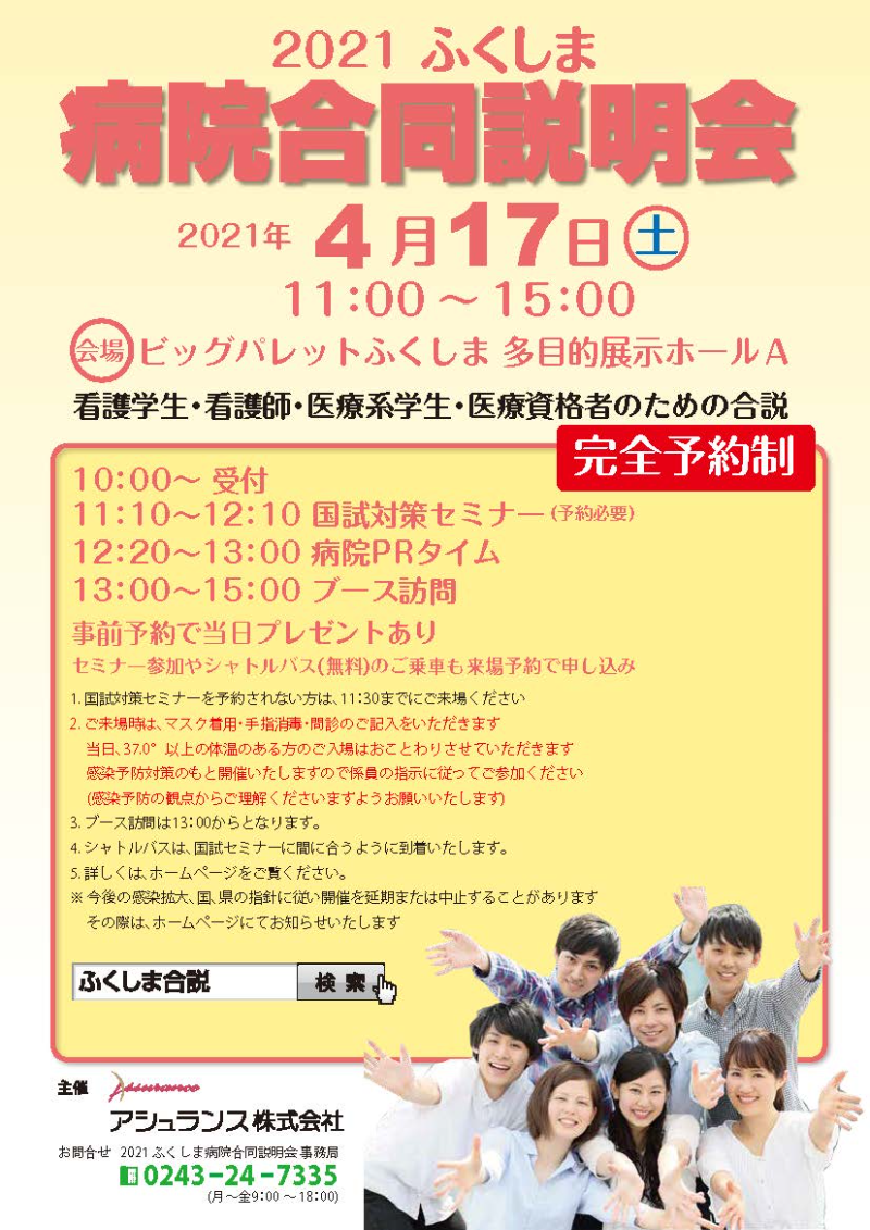 2021 ふくしま病院合同説明会はビッグパレットふくしまでの開催は中止となり、開催場所が郡山ユラックス熱海(多目的ホール)へと変更となりました。開催日及び開催時間の変更はありません。詳細は、https://www.assurance-fukushima.jp/gousetsu/をご確認ください。