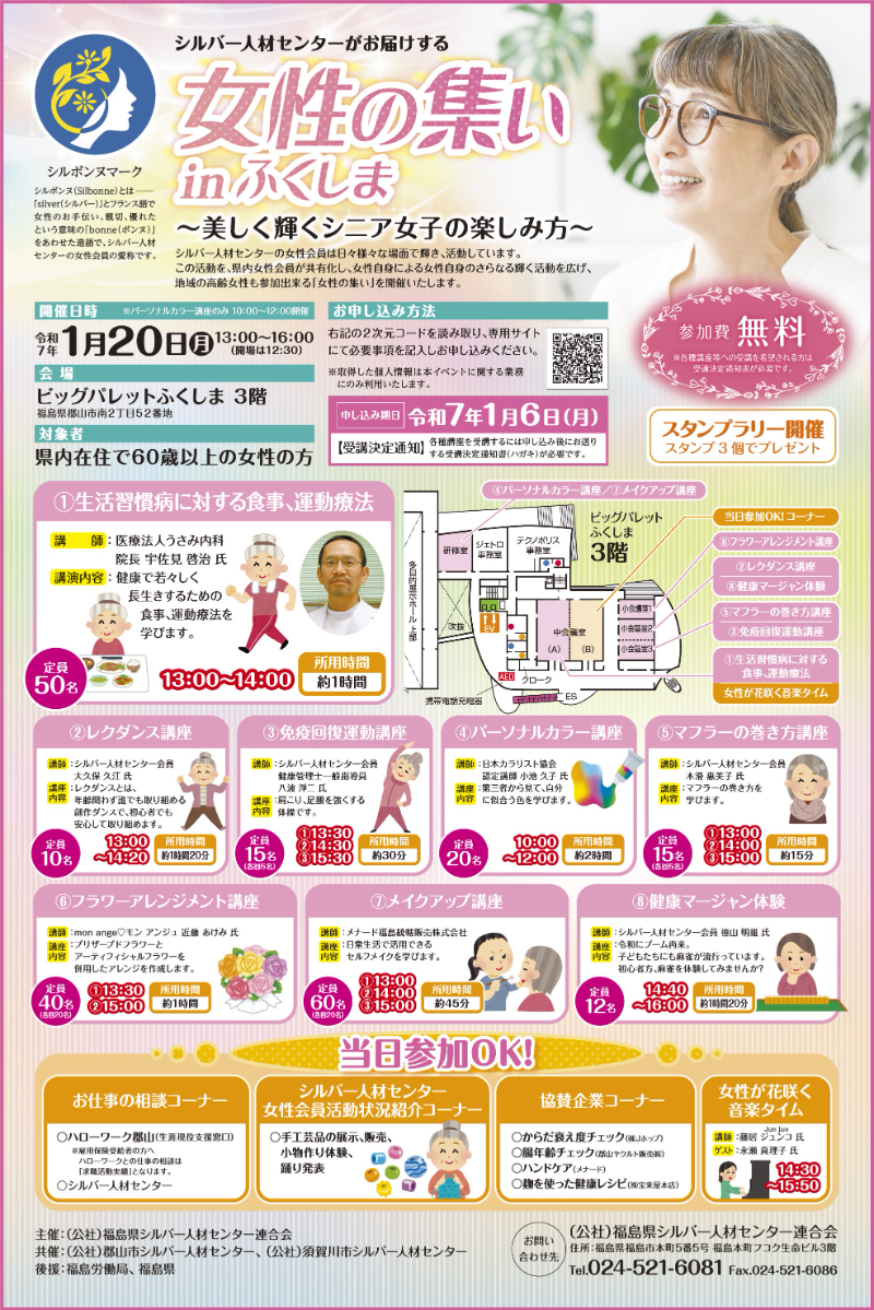 60歳以上の女性を対象に、女性自身の輝く活動を広げる機会を支援するための講演など。