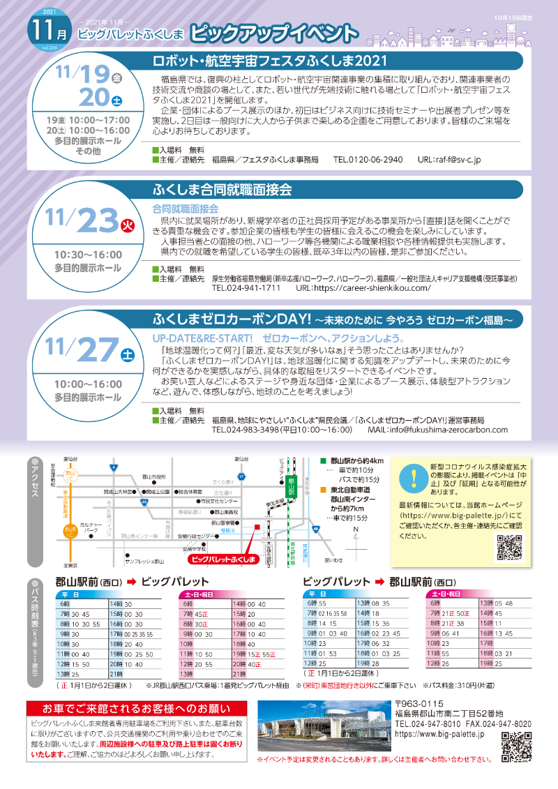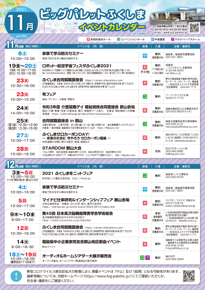 2021年10月27日(水) 11月号イベントカレンダー発行のお知らせ 11月号イベントカレンダーチラシとポスターの発行しました。ホームページのイベントカレンダーは随時更新しています。 添付データ イベントカレンダー11月号(1692.9KB) ビッグパレットからのお知らせ 2026年4月2日(木) 施設空き状況のお知らせ 2026年3月26日(木) 令和8年4月号イベントカレンダー発行のお知らせ 2026年2月25日(水) 令和8年3月号イベントカレンダー発行のお知らせ View AllTOP