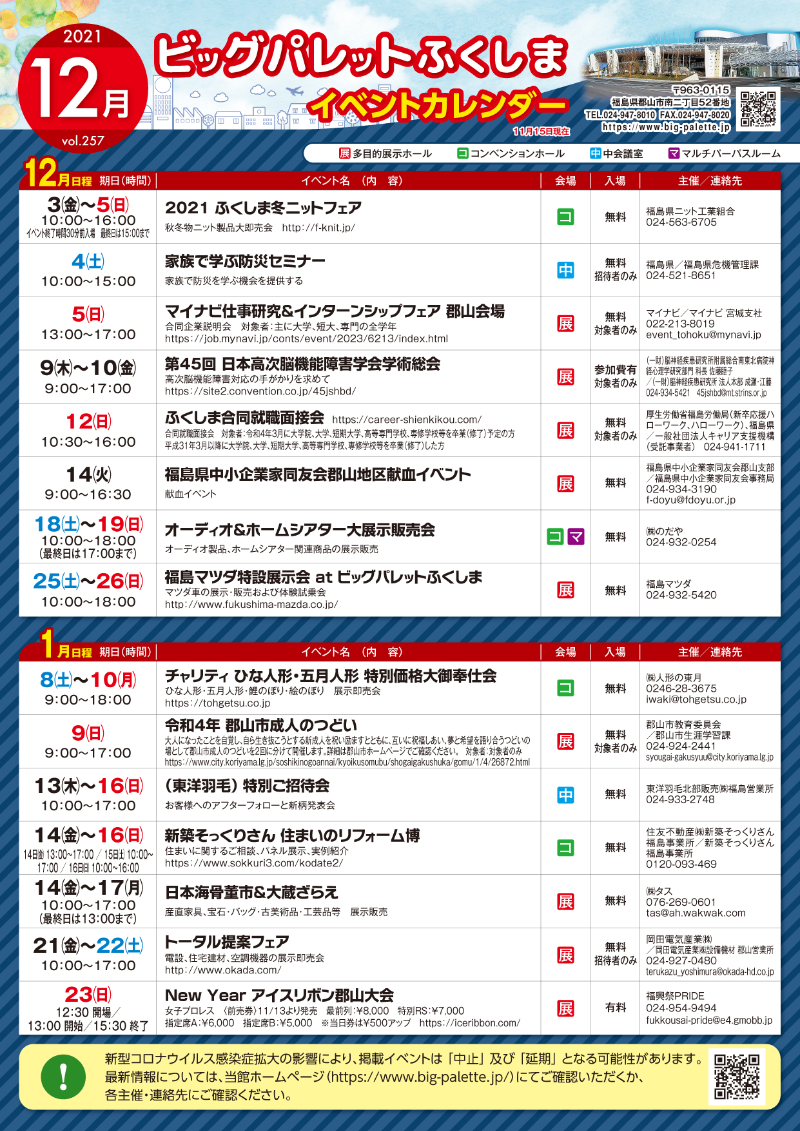 2021年11月30日(火) 12月号イベントカレンダー発行のお知らせ 12月号イベントカレンダーチラシとポスターの発行しました。ホームページのイベントカレンダーは随時更新しています。 添付データ イベントカレンダー12月号(1692.9KB) ビッグパレットからのお知らせ 2026年4月2日(木) 施設空き状況のお知らせ 2026年3月26日(木) 令和8年4月号イベントカレンダー発行のお知らせ 2026年2月25日(水) 令和8年3月号イベントカレンダー発行のお知らせ View AllTOP