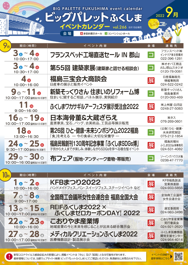 2022年8月25日(木) 9月号イベントカレンダー発行のお知らせ 9月号イベントカレンダーチラシとポスターの発行をしました。ホームページのイベントカレンダーは随時更新しています。 添付データ イベントカレンダー9月号(表面)(4081.2KB) イベントカレンダー9月号(表面)(3936.7KB) ビッグパレットからのお知らせ 2026年4月2日(木) 施設空き状況のお知らせ 2026年3月30日(月) 4月4日(土)~5日(日)の駐車場の混雑について 2026年3月26日(木) 令和8年4月号イベントカレンダー発行のお知らせ View AllTOP