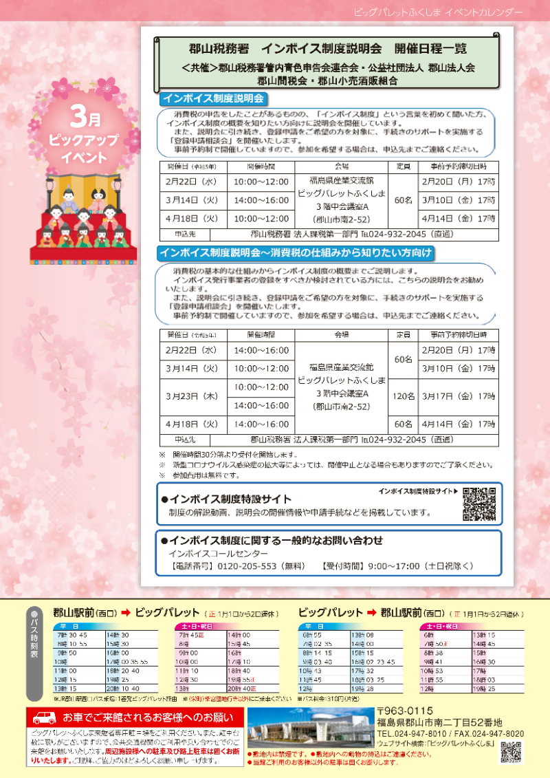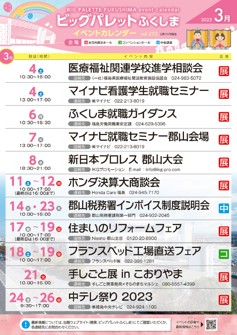2023年2月27日(月) 令和5年3月号イベントカレンダー発行のお知らせ 3月号イベントカレンダーチラシとポスターを発行しました。ホームページのイベントカレンダーは随時更新しています。 添付データ イベントカレンダー3月号(チラシ)(2975.7KB) ビッグパレットからのお知らせ 2026年4月17日(金) 施設空き状況のお知らせ 2026年3月26日(木) 令和8年4月号イベントカレンダー発行のお知らせ 2026年2月25日(水) 令和8年3月号イベントカレンダー発行のお知らせ View AllTOP