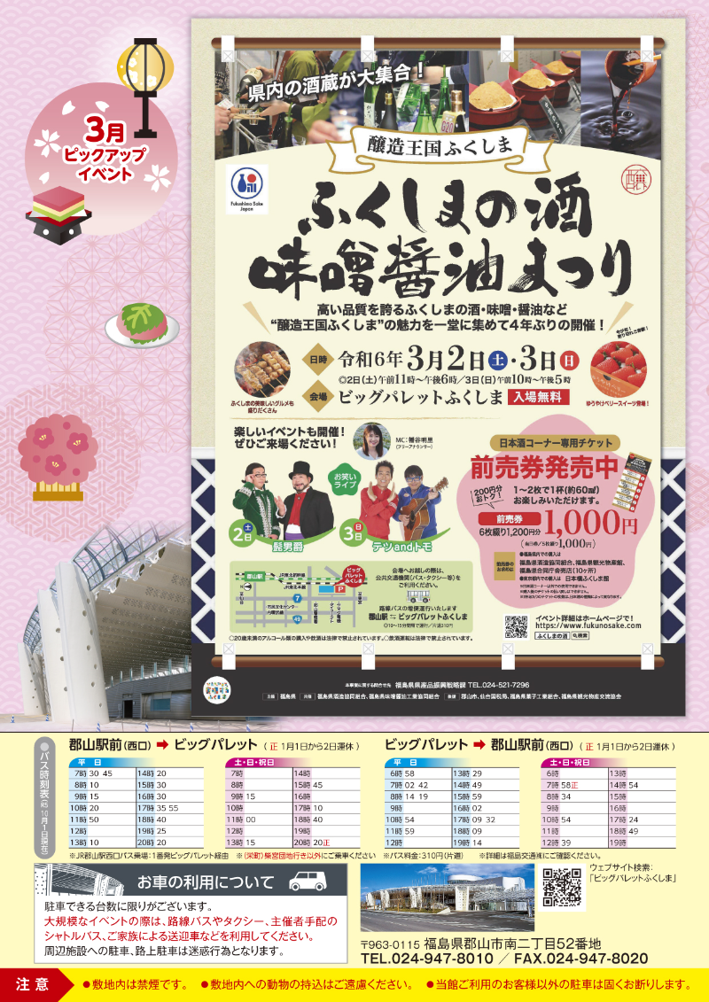 2024年2月25日(日) 令和6年3月号イベントカレンダー発行のお知らせ 3月号イベントカレンダーチラシとポスターを発行しました。ホームページのイベントカレンダーは随時更新しています。 添付データ 令和6年3月号イベントカレンダー.pdf(3422.1KB) ビッグパレットからのお知らせ 2026年3月26日(木) 令和8年4月号イベントカレンダー発行のお知らせ 2026年3月16日(月) 施設空き状況のお知らせ 2026年2月25日(水) 令和8年3月号イベントカレンダー発行のお知らせ View AllTOP