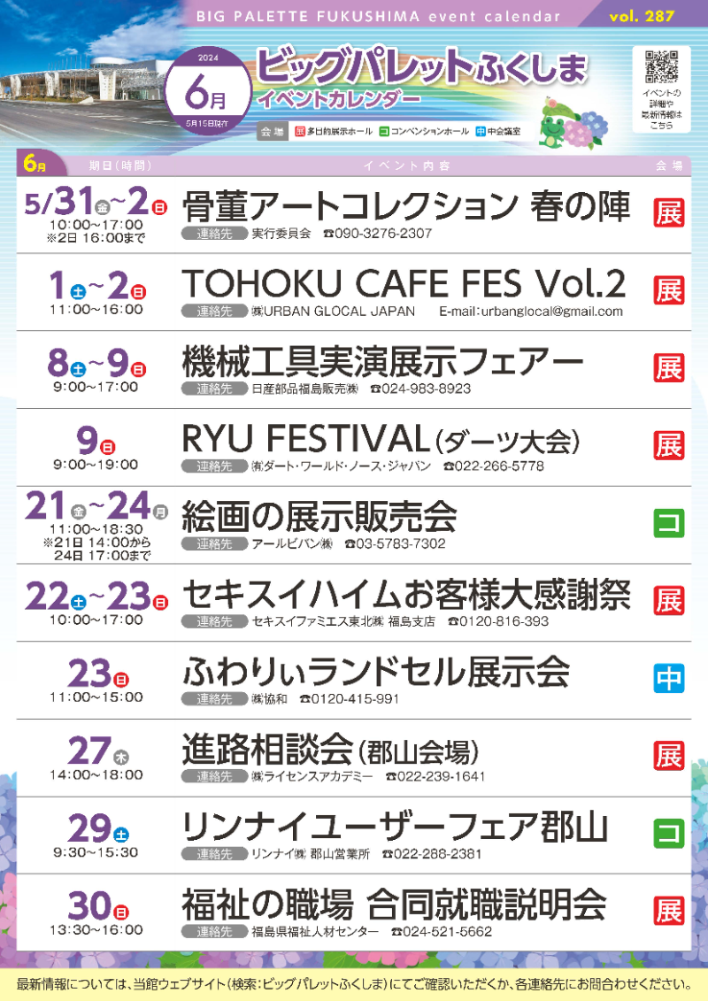 2024年5月24日(金) 令和6年6月号イベントカレンダー発行のお知らせ 6月号イベントカレンダーチラシとポスターを発行しました。ホームページのイベントカレンダーは随時更新しています。 添付データ 令和6年6月号イベントカレンダー(2888.3KB) ビッグパレットからのお知らせ 2026年3月3日(火) 施設空き状況のお知らせ 2026年2月25日(水) 令和8年3月号イベントカレンダー発行のお知らせ 2026年1月25日(日) 令和8年2月号イベントカレンダー発行のお知らせ View AllTOP