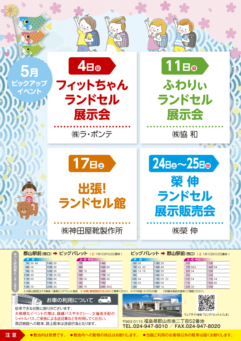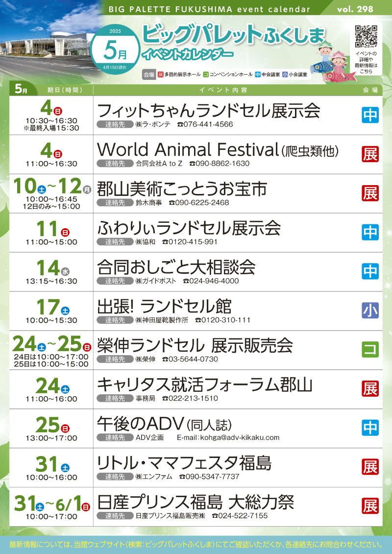 2025年4月25日(金) 令和7年5月号イベントカレンダー発行のお知らせ 5月号イベントカレンダーチラシとポスターを発行しました。ホームページのイベントカレンダーは随時更新しています。 添付データ イベントカレンダー5月号PDF(4043.3KB) ビッグパレットからのお知らせ 2026年3月3日(火) 施設空き状況のお知らせ 2026年2月25日(水) 令和8年3月号イベントカレンダー発行のお知らせ 2026年1月25日(日) 令和8年2月号イベントカレンダー発行のお知らせ View AllTOP