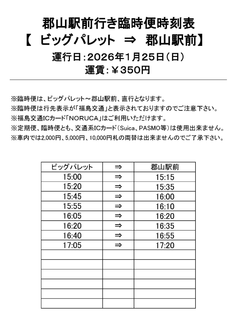 2026年1月20日(火) NEW 1月25日(日)の催事に伴う臨時バスダイヤのご案内 1月25日(日)の催事に伴う臨時バスダイヤのご案内をいたします。 ビッグパレットからのお知らせ 2026年1月20日(火) 1月25日(日)の催事に伴う臨時バスダイヤのご案内 2026年1月15日(木) 施設空き状況のお知らせ 2025年12月23日(火) 令和8年1月号イベントカレンダー発行のお知らせ View AllTOP