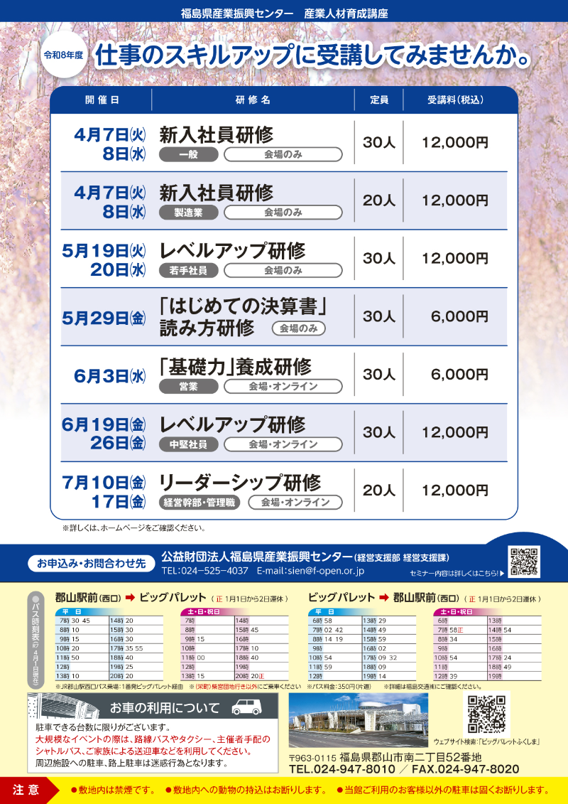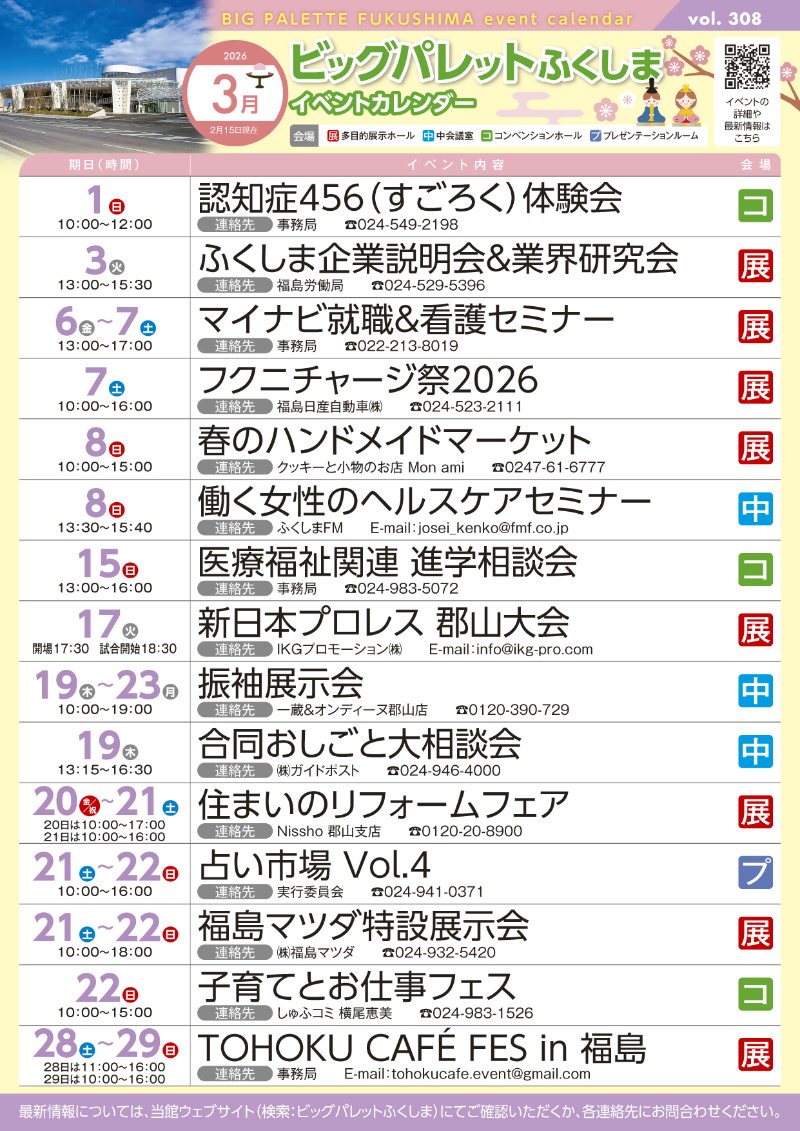 2026年2月25日(水) 令和8年3月号イベントカレンダー発行のお知らせ 3月号イベントカレンダーチラシとポスターを発行しました。ホームページのイベントカレンダーは随時更新しています。 添付データ イベントカレンダー3月号PDF(2379.7KB) ビッグパレットからのお知らせ 2026年4月2日(木) 施設空き状況のお知らせ 2026年3月26日(木) 令和8年4月号イベントカレンダー発行のお知らせ 2026年2月25日(水) 令和8年3月号イベントカレンダー発行のお知らせ View AllTOP