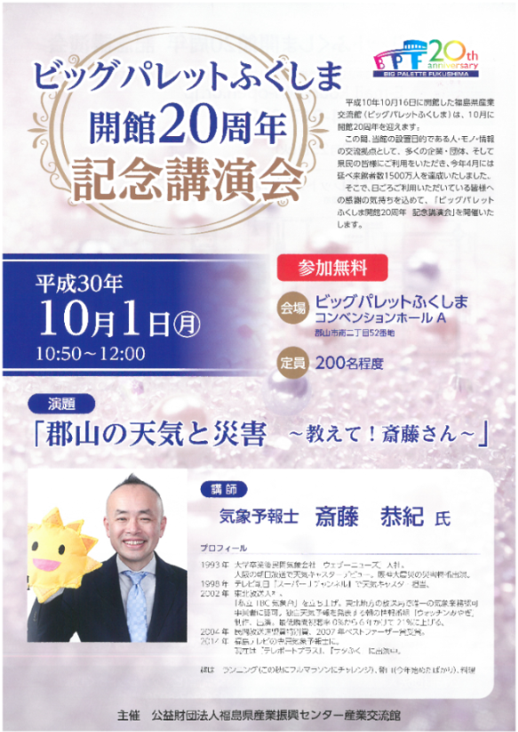 そこで、日ごろから、多大なるご支援とご協力を賜っている皆様に感謝の気持ちを込めまして、「ビッグパレットふくしま開館20周年 記念講演会」を開催いたします。