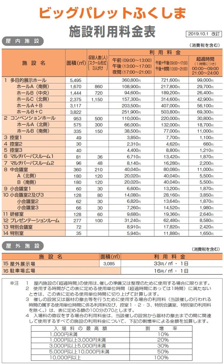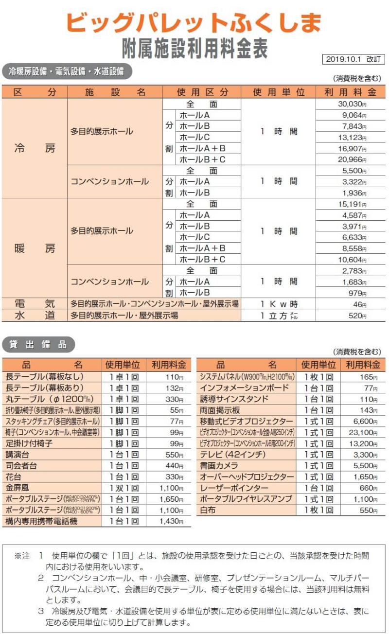 ビッグパレットふくしま(福島県産業交流館)では、令和元年10月1日から実施される消費税率の引上げに伴い、施設利用料及び附属施設利用料を同日付けで改定いたします(本改定は、福島県産業交流館条例及び福島県産業交流館条例施行規則の改正に基づくものです。)。